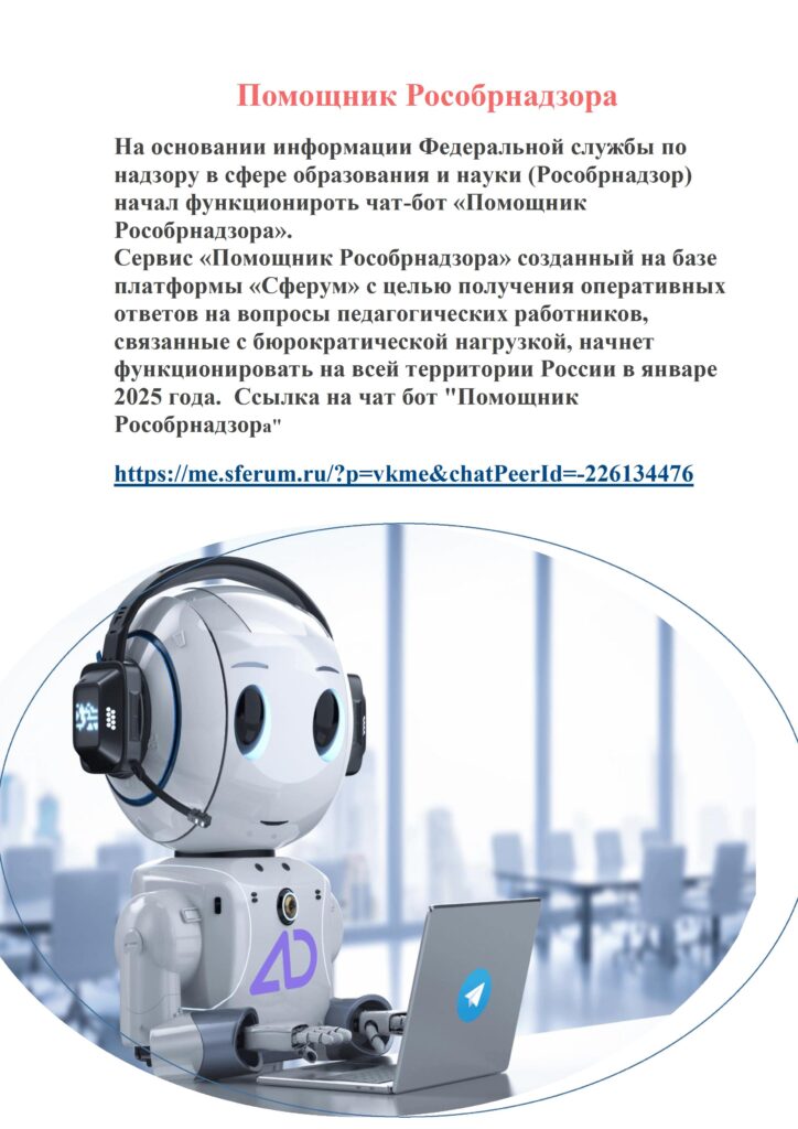 На основании информации Федеральной службы по надзору в сфере образования и науки (Рособрнадзор) начал функционироть чат-бот «Помощник Рособрнадзора». Сервис «Помощник Рособрнадзора» созданный на базе платформы «Сферум» с целью получения оперативных ответов на вопросы педагогических работников, связанные с бюрократической нагрузкой, начнет функционировать на всей территории России в январе 2025 года. Ссылка на чат бот «Помощник Рособрнадзора«